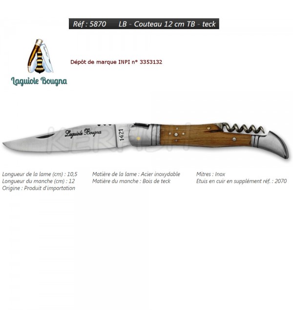 Le manche est en bois de teck, bois tropical noble et résistant. Les mitres sont en inox. La lame est en acier inoxydable J2-420 et mesure 10,5 cm . Quant au manche, sa taille est de 12 cm.